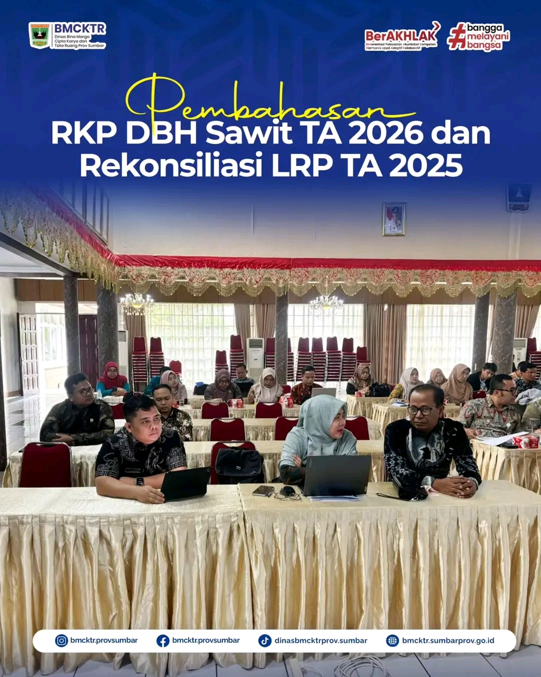 Padang - 29 - 30 Januari 2026, Pemerintah Provinsi Sumatera Barat melaksanakan kegiatan Pembahasan Rancangan Kegiatan dan Penganggaran (RKP) Dana Bagi Hasil (DBH) Sawit Tahun Anggaran 2026 serta Rekonsiliasi Laporan Realisasi Penggunaan (LRP) DBH Sawit Tahun Anggaran 2025, bertempat di Istana Bung Hatta, Kota Bukittinggi. Kegiatan ini dibuka secara resmi oleh Kepala Bidang Bina Marga Dinas Bina Marga, Cipta Karya, dan Tata Ruang (BMCKTR) Provinsi Sumatera Barat, Bapak Adratus Setiawan, ST, MT, yang dalam sambutannya menegaskan pentingnya ketepatan perencanaan, kepatuhan terhadap regulasi, serta kelengkapan dokumen sebagai dasar utama dalam pengelolaan DBH Sawit. Selama dua hari pelaksanaan, kegiatan diisi dengan penyampaian materi dan pelaksanaan desk Kabupaten/Kota, yang bertujuan untuk melakukan verifikasi dan klarifikasi RKP DBH Sawit TA 2026 serta LRP DBH Sawit TA 2025. Pada kesempatan ini, Dinas BMCKTR Provinsi Sumatera Barat berperan sebagai panelis bidang Pekerjaan Umum khususnya dalam melakukan pengecekan substansi kegiatan infrastruktur jalan, kesesuaian teknis, serta sinkronisasi usulan daerah dengan kebijakan yang berlaku. Melalui kegiatan ini diharapkan seluruh usulan kegiatan DBH Sawit dapat disusun secara akuntabel, tepat sasaran, dan siap dilaksanakan, serta laporan realisasi penggunaan DBH Sawit Tahun Anggaran 2025 dapat dipertanggungjawabkan secara administratif dan teknis, sehingga proses penyaluran DBH Sawit Tahun Anggaran 2026 dapat berjalan tepat waktu dan optimal.